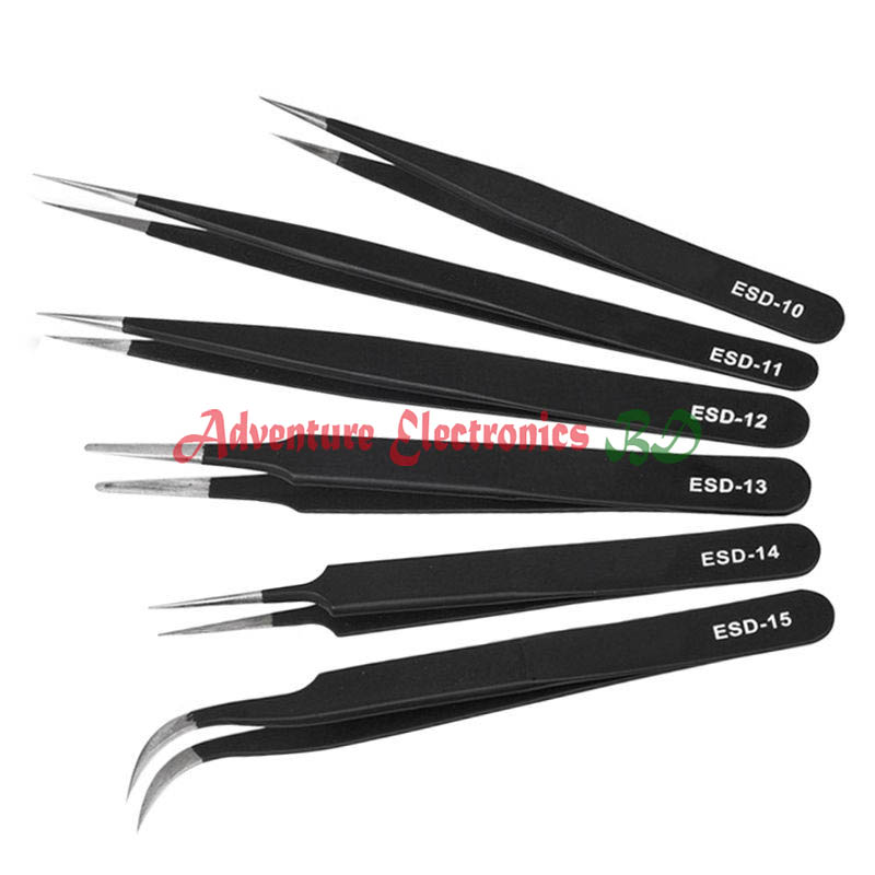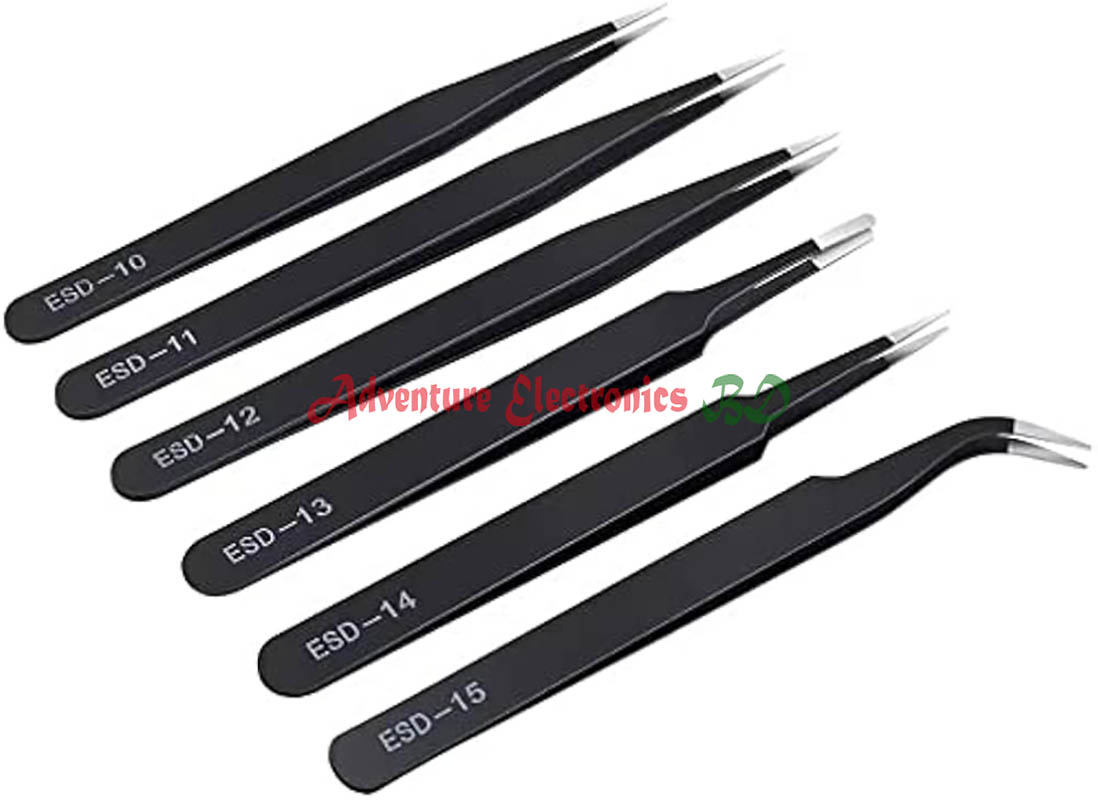 6 Pcs ESD TWEEZERS SET】6 Pcs of precision anti static tweezer set, including 1 pcs of curved tips tweezers and 5 pcs of pointy tips tweezers for different purposes.You can use these ESD tweezers for craft, electronics, jewelry-making, laboratory work, etc